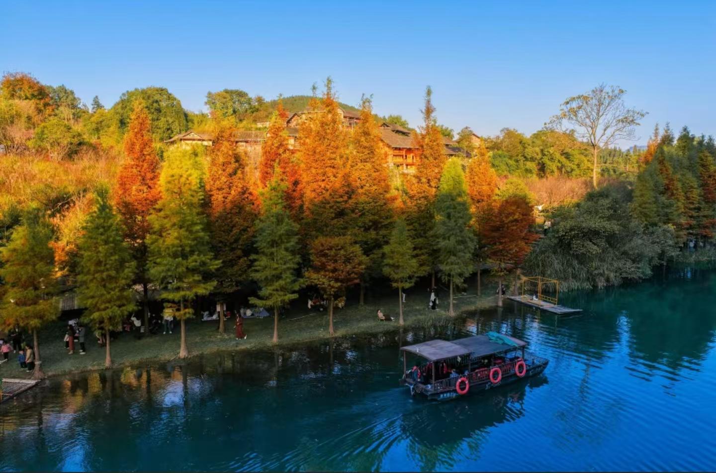 初冬时节,乌羊麻景区内羊昌河畔挺拔的杉树褪去绿装,染上橙红、金黄,与晴空下翡翠般的羊昌河相映成趣,宛如一幅灵动的暖冬水彩画。景区内游人如织,大家或拍照或围炉煮茶。