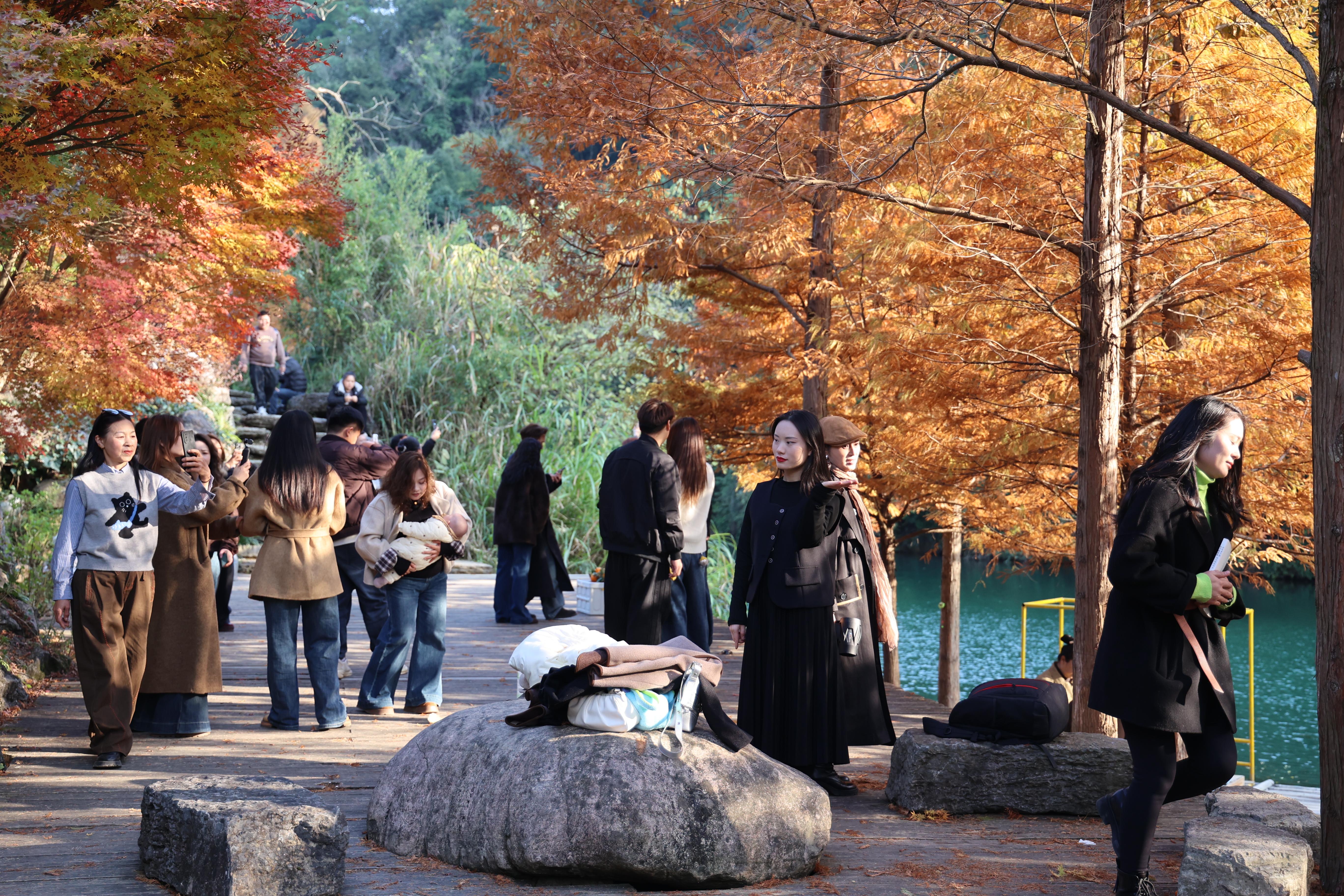 “我是在抖音上看到大家说这边拍照比较好看。”游客张女士边拍照边高兴地说:“就和家人一起过来看看,这里的叶子金黄金黄的,水翠绿翠绿的,拍出的照片也挺好看的,挺能出圈的。”